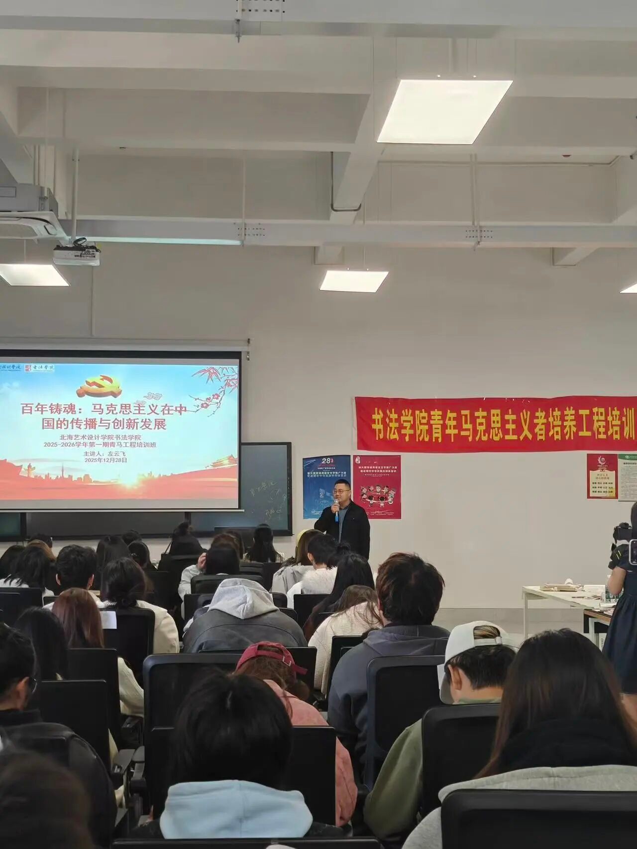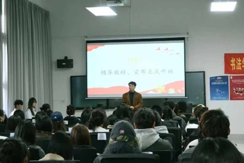 12月28日,书法学院在艺德楼507教研室启动2025-2026学年第一期青年马克思主义者培养工程培训班,并邀请校党委副书记陈毅华、书法学院党支部副书记左云飞为学员授课。书法学院党支部副书记左云飞、副院长兼分团委书记李家琪、学工办主任胡慧捷、分团委指导老师石建玲、柳涵懿出席开班仪式,书法学院各年级学生代表参加培训。