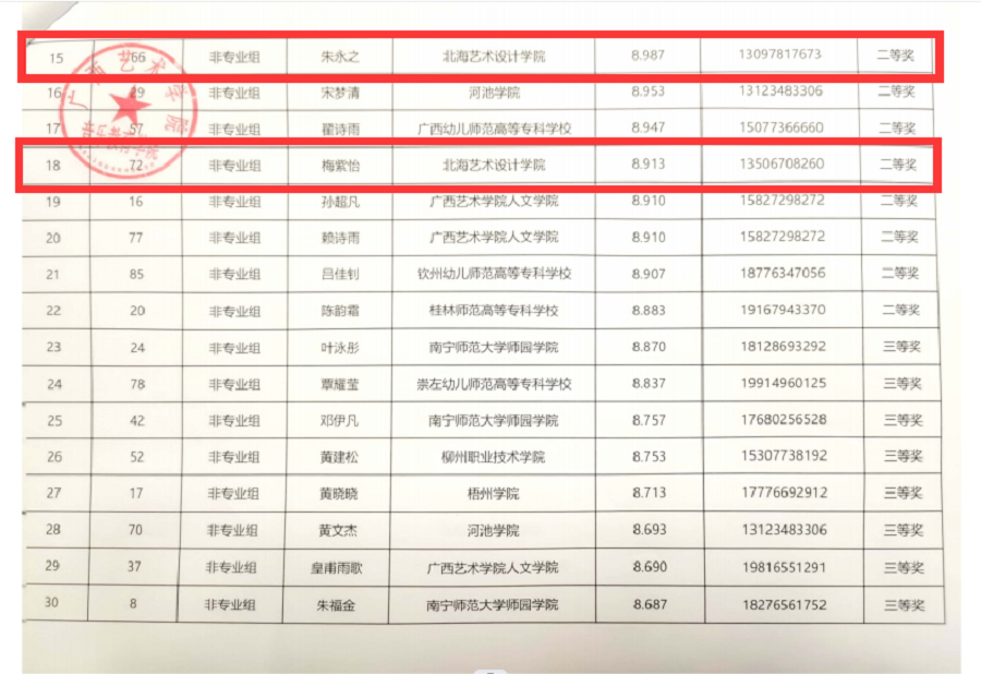 本届大赛邀请了来自上海音乐学院、四川音乐学院、广西艺术学院等区内外20余位知名专家担任评委。经过激烈的角逐,我校哲学专业的朱永之和艺术教育专业的梅紫怡取得了非专业组二等奖,这也是我校学生第一次在此项比赛中取得的最佳成绩。