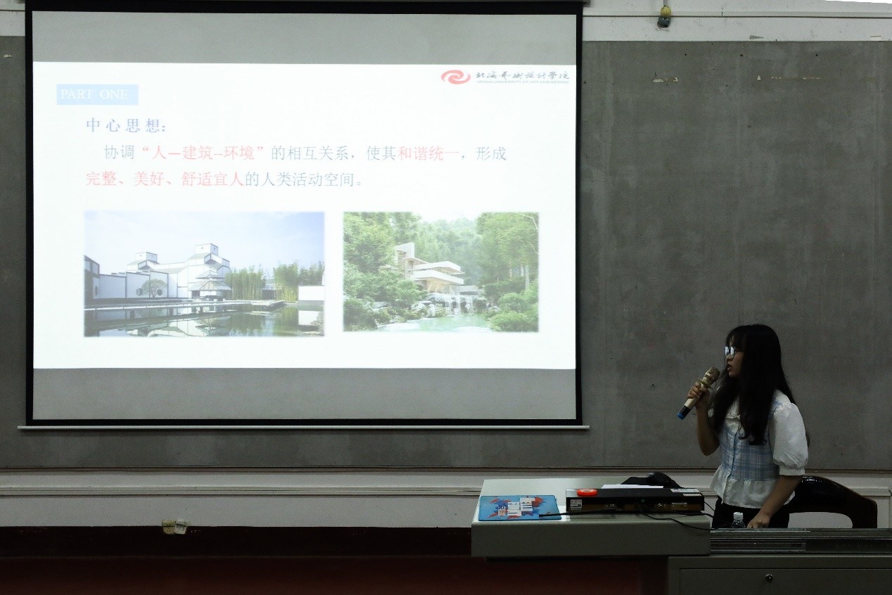 接着,林珍娴同学又从专业知识、学习经验两方面与同学们做了分享。她指出环境设计的中心思想,即协调“人—建筑—环境”的相互关系,使其和谐统一,形成完整、美好、舒适宜人的人类活动空间。她鼓励同学们树立正确的学习态度,发现自身存在的问题,找到适合自己的学习方法。