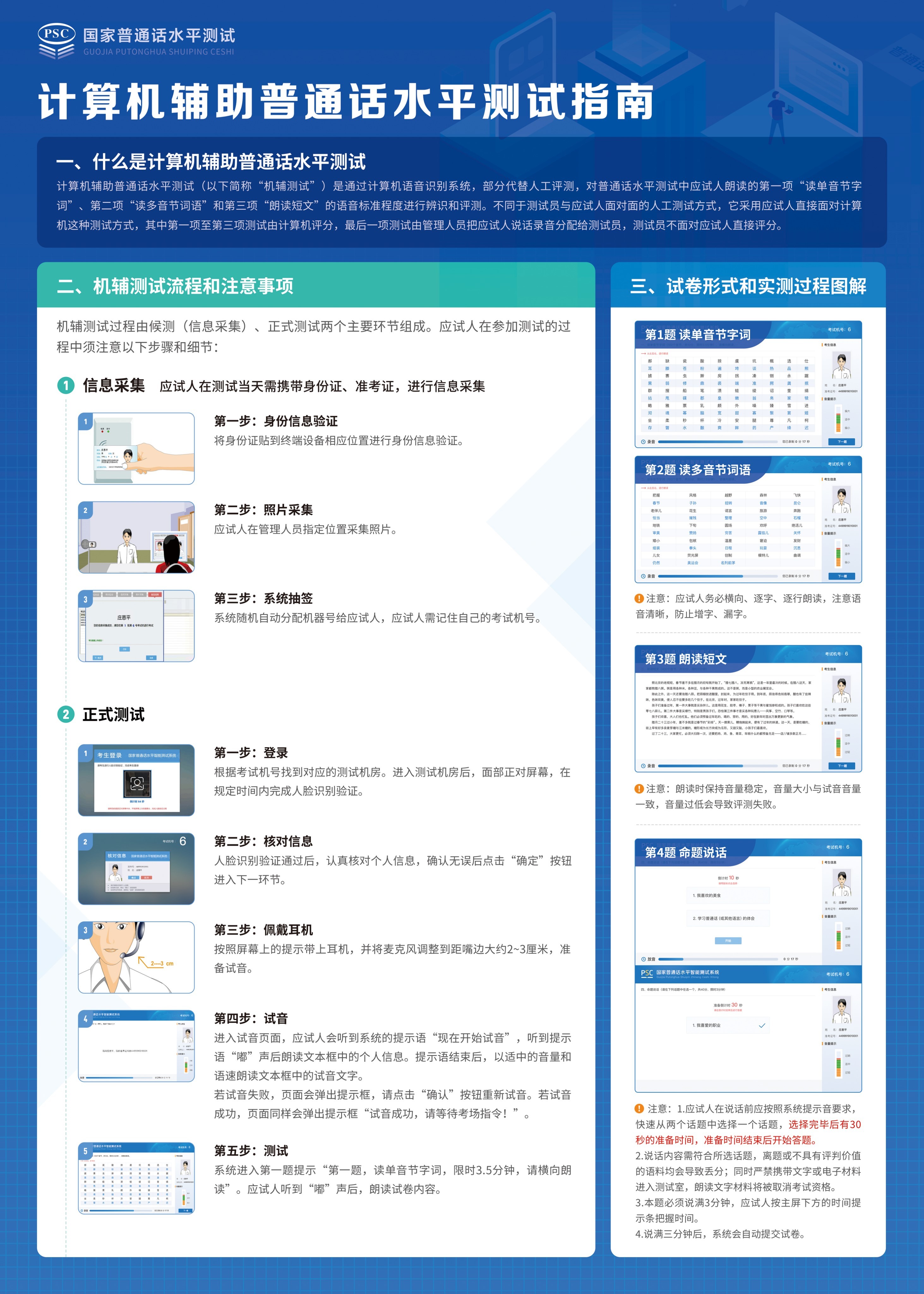 (二)考试流程。具体考试流程按照计算机辅助普通话水平测试指南(附件2)、普通话水平测试考试指南(附件3)执行。