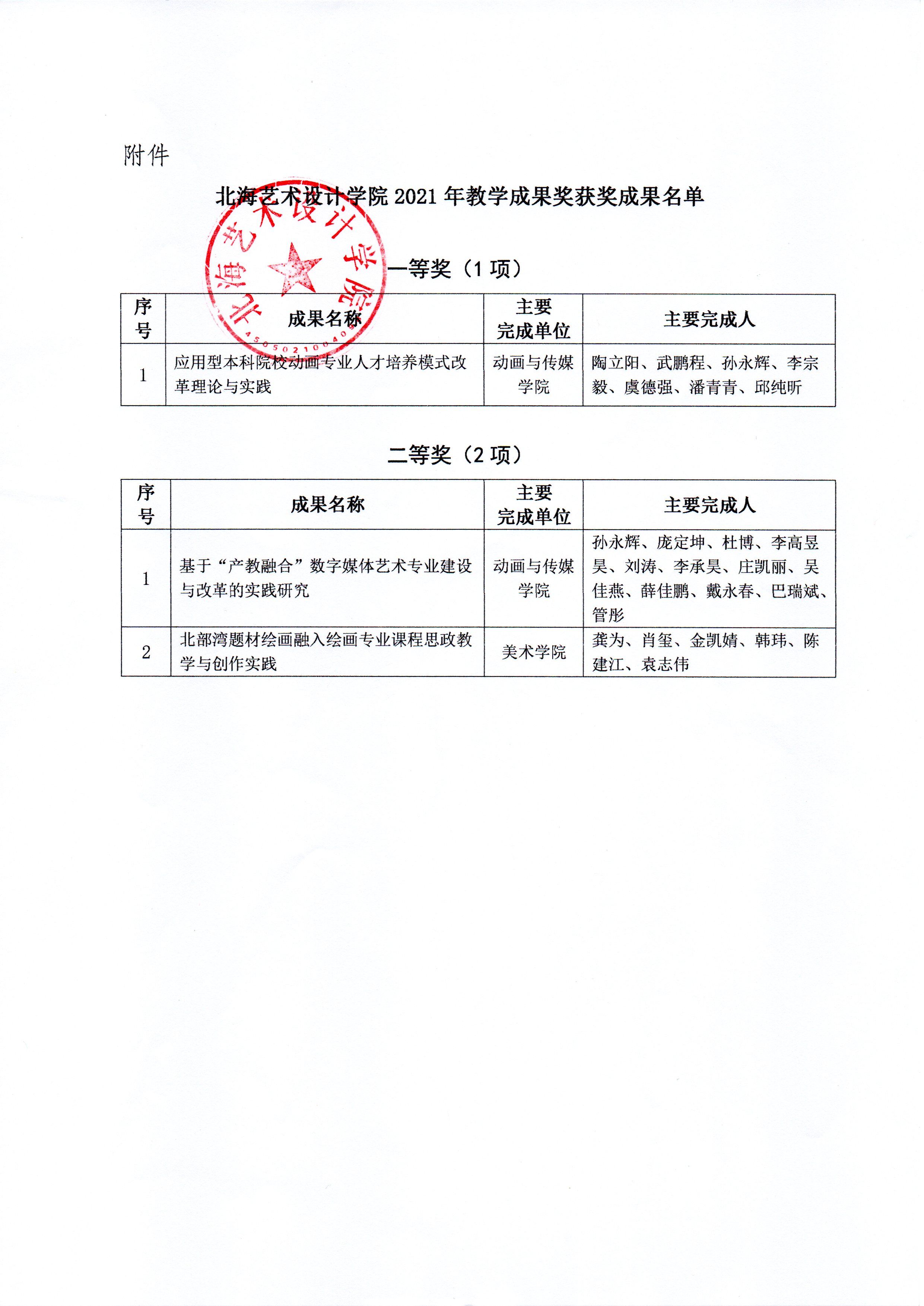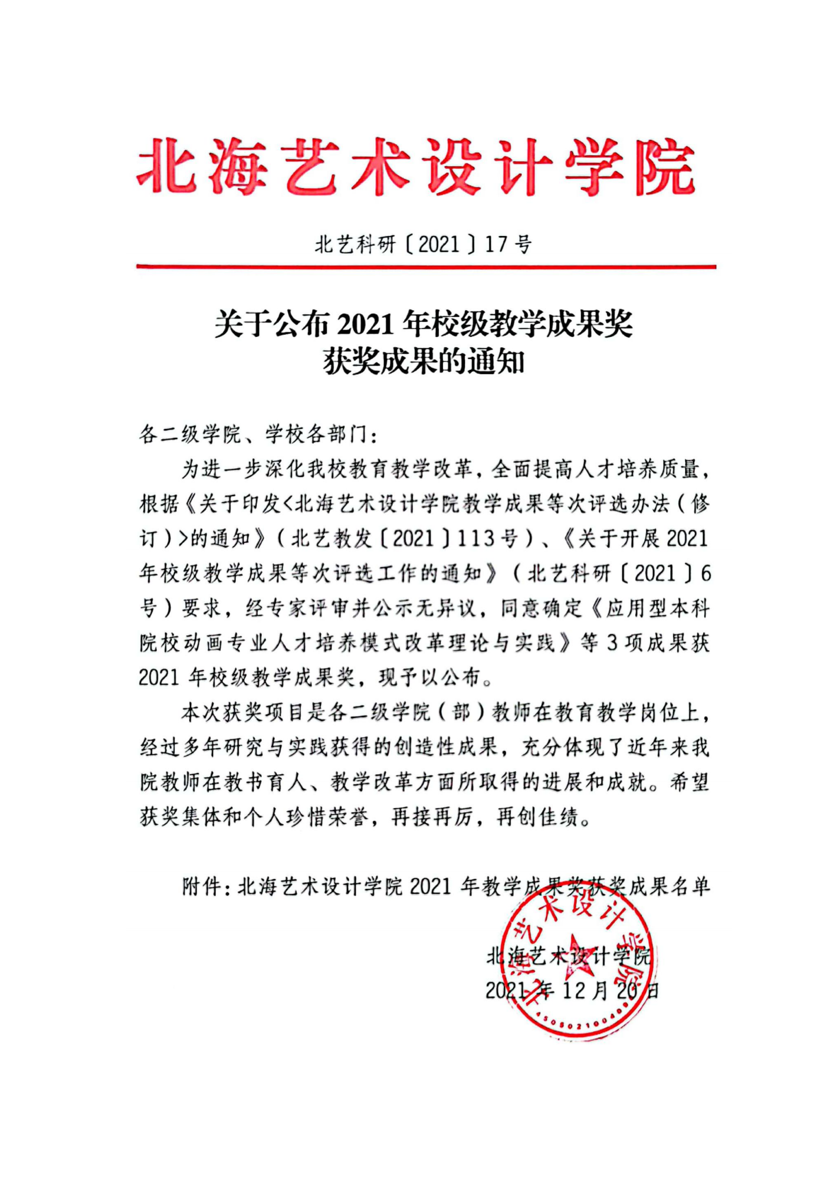北艺科研〔2021〕17号关于公布2021年校级教学成果奖获奖成果的通知