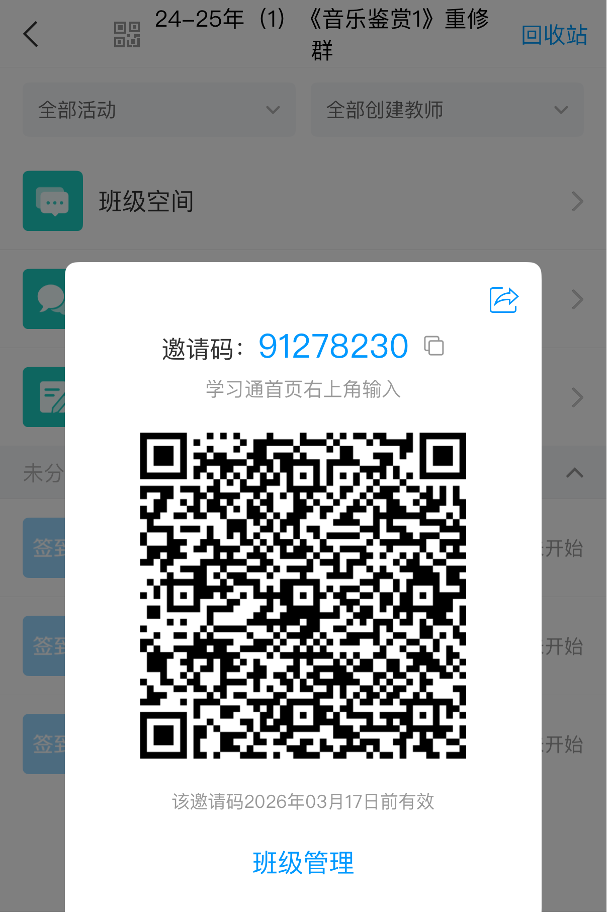 3.《音乐鉴赏》重修采取新开班重修方式。重修对象须在20251017日前,前往南校区体育馆503办公室重修表格,并加入学习通重修班级群(2024-2025学期《音乐鉴赏1》重修群”班级邀请码91278230,在手机APP首页右上角输入或扫码加入)。