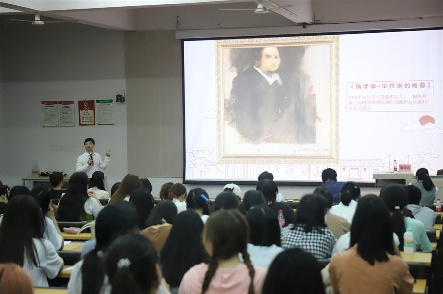 讲座伊始,谭教授以“电脑比莎士比亚写得好”的灵魂之问引发出人工智能时代的知识危机问题,通过对人工智能AI技术的发展成熟并创造出一系列的自动写作机器人的举例讲解,说明由人工智能AI技术所创造的艺术绘画作品以及自动写作机器人的写作水平堪比人类创作者。谭武军教授还借以由机器人程序创作的赞美“北艺”抒情诗为例,批判由机器人程序创作的外包“论文写作”所触发的外包思维,他鼓励广大学子在辽阔知识信息中,要学会批判性的思维和推理,并养成独立思考的习惯,进行独立创作。