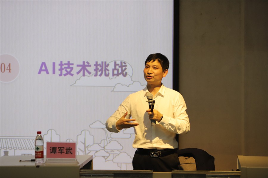 谭武军教授通过提出“在黑科技不断占领生活的时代里,文学除了被‘黑’,还有没有发光‘黑’技术?”的问题,指出人工智能不能写的四个方面,即不能写综合的思维认知、价值的分析判断、情感的细腻流露以及语言的个性表达。从而勉励广大师生避免写作思维模式的俗套化,要讲真话、说真情,强化对思维认知和逻辑性表达能力的训练。