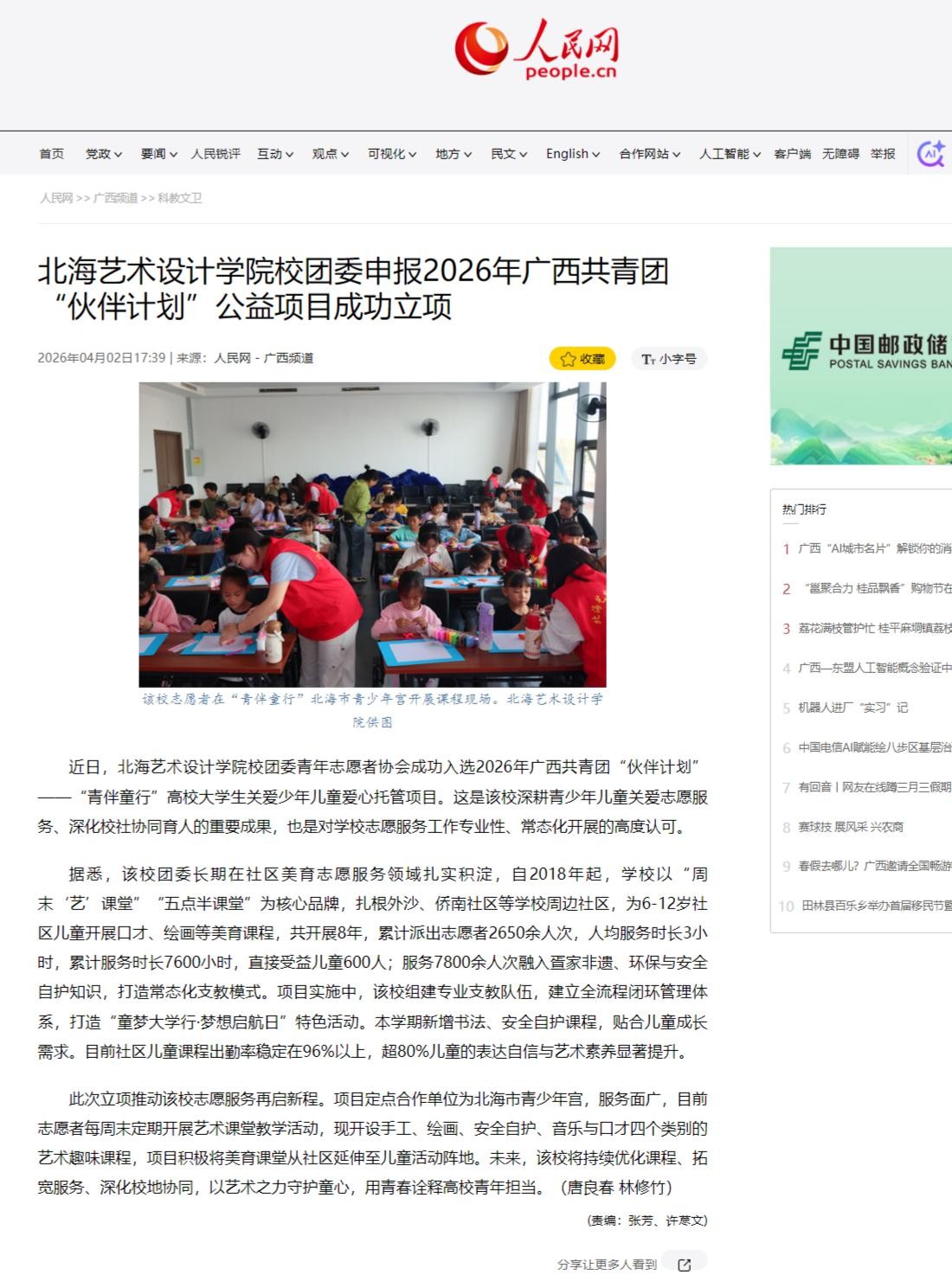 人民网:北海艺术设计学院校团委申报2026年广西共青团“伙伴计划”公益项目成功立项
