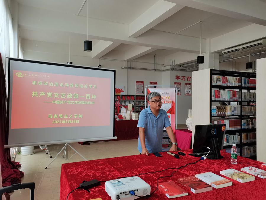 在全党如火如荼地开展党史学习教育之际,2021年5月28日下午,马克思主义学院组织全体党员、教师,在学校图书馆党史阅读角开展思想政治理论课教师理论学习暨党史学习专题党课活动,由马克思主义学院罗喜江教授作题为《共产党文艺政策一百年——中共文艺政策的形成》的党史知识培训。活动由马克思主义学院院长姜献生教授主持。
