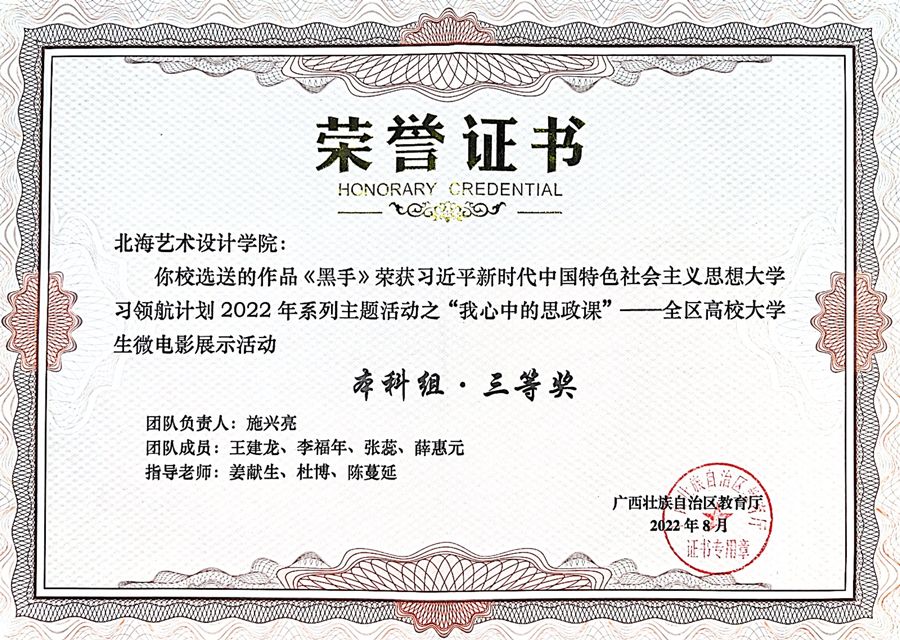 经全区各高校初选推荐,自治区教育厅组织专家评审,认定了“我心中的思政课”全区高校大学生微电影展示活动优秀作品101部,其中,我校马克思主义学院、动画与传媒学院依托合作共建的思政课实践教学研习基地“红色影视创作室”,组织指导学生创作的作品《登台亮相》《黑手》分别获得“我心中的思政课”——全区高校大学生微电影展示活动本科组二等奖、三等奖。