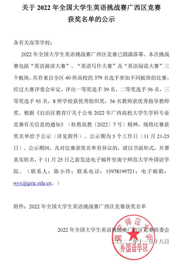 2022年11月21日,广西本科教育网公布了2022年全国大学生英语挑战赛广西区竞赛获奖名单。我校学生朱易荣获“英语写作大赛”板块二等奖 ,吴语桐荣获“英语写作大赛”板块三等奖、“英语阅读大赛”板块三等奖。