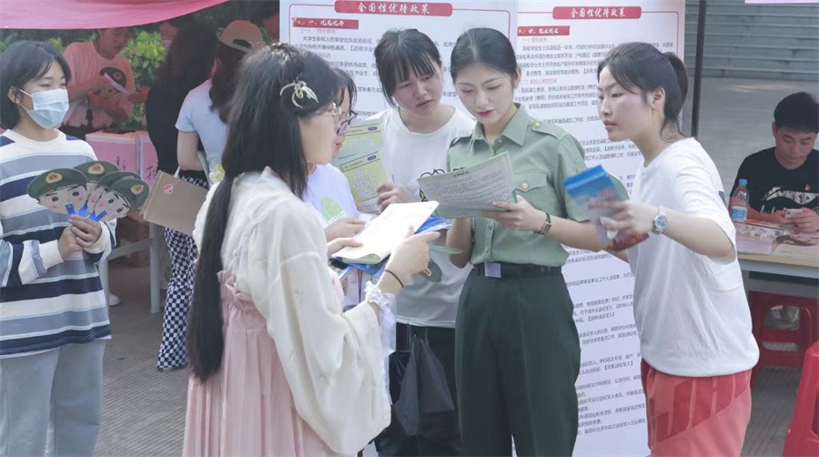 坚持价值引领,涵养家国情怀。学校积极推进基层就业项目,校征兵工作站组织退伍学生成立尚行先锋营,协助学校开展国防教育、军事训练、征兵宣传等活动,为了将应征入伍政策的宣传更加深入人心,退伍学生担任征兵政策宣传员,从个人的入伍经历、征兵入伍流程、优先优待、复学升学等方面,对前来咨询的同学做全方面、多角度的政策解读和经验分享。通过校友分享、政策宣传等方式,帮助学生认识基层、了解基层,进一步激发基层就业热情。大力宣传基层就业毕业生典型事迹,引导毕业生树立正确的成才观、就业观和择业观,鼓励毕业生“下得去、留得住、干得好、流得动”,服务国家就业优先和人才强国战略。