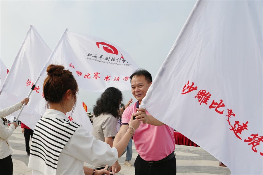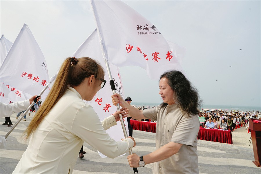北海旅游集团副总经理李小军,学校常务副校长胡胜、副书记陈毅华为沙雕代表队授旗