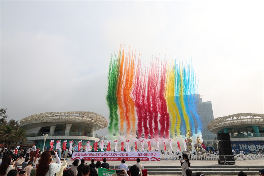 随着卢新华校长的宣布声落下,彩色烟花绚烂升空,北海银滩沙雕比赛暨北海艺术设计学院第二十二届沙滩运动会正式开幕,相关比赛项目随之进行。