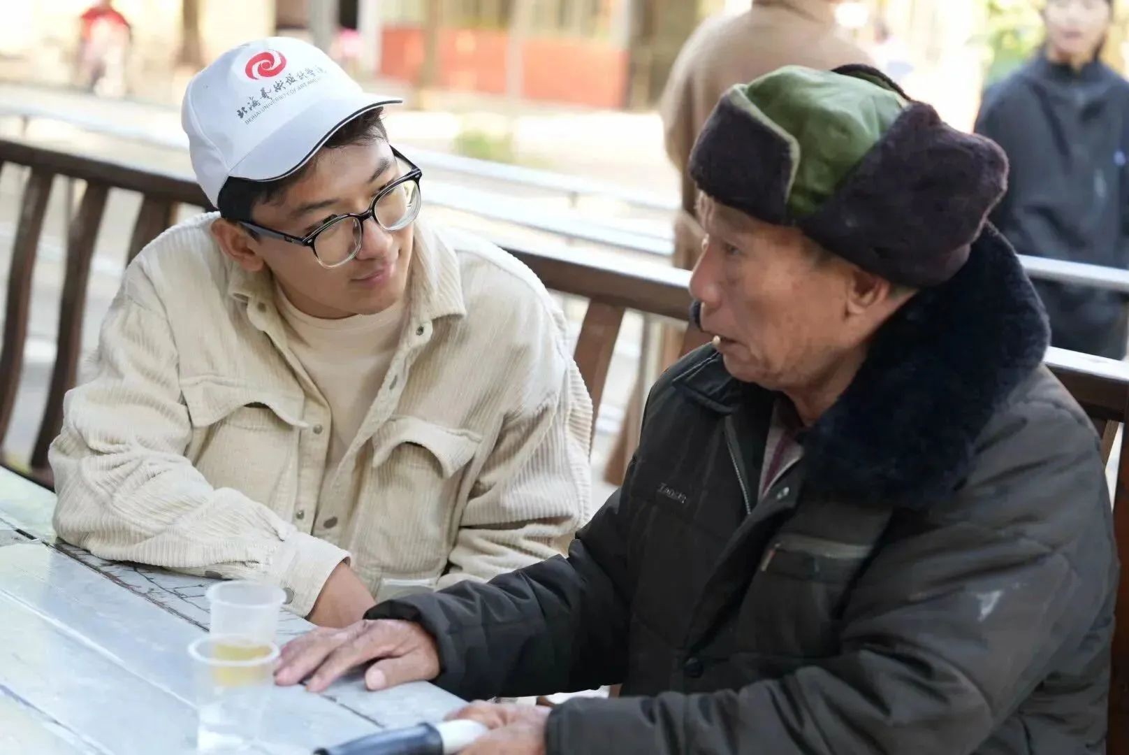 (志愿者为老人暖手)