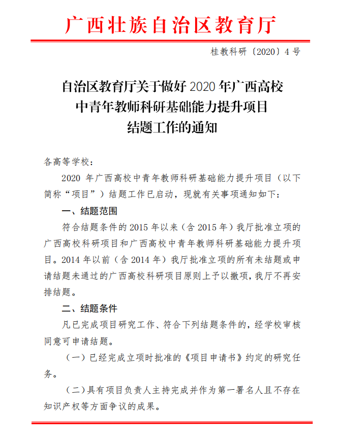 自治区教育厅关于做好2020年度广西高校中青年 教师科研基础能力提升项目结题工作的通知