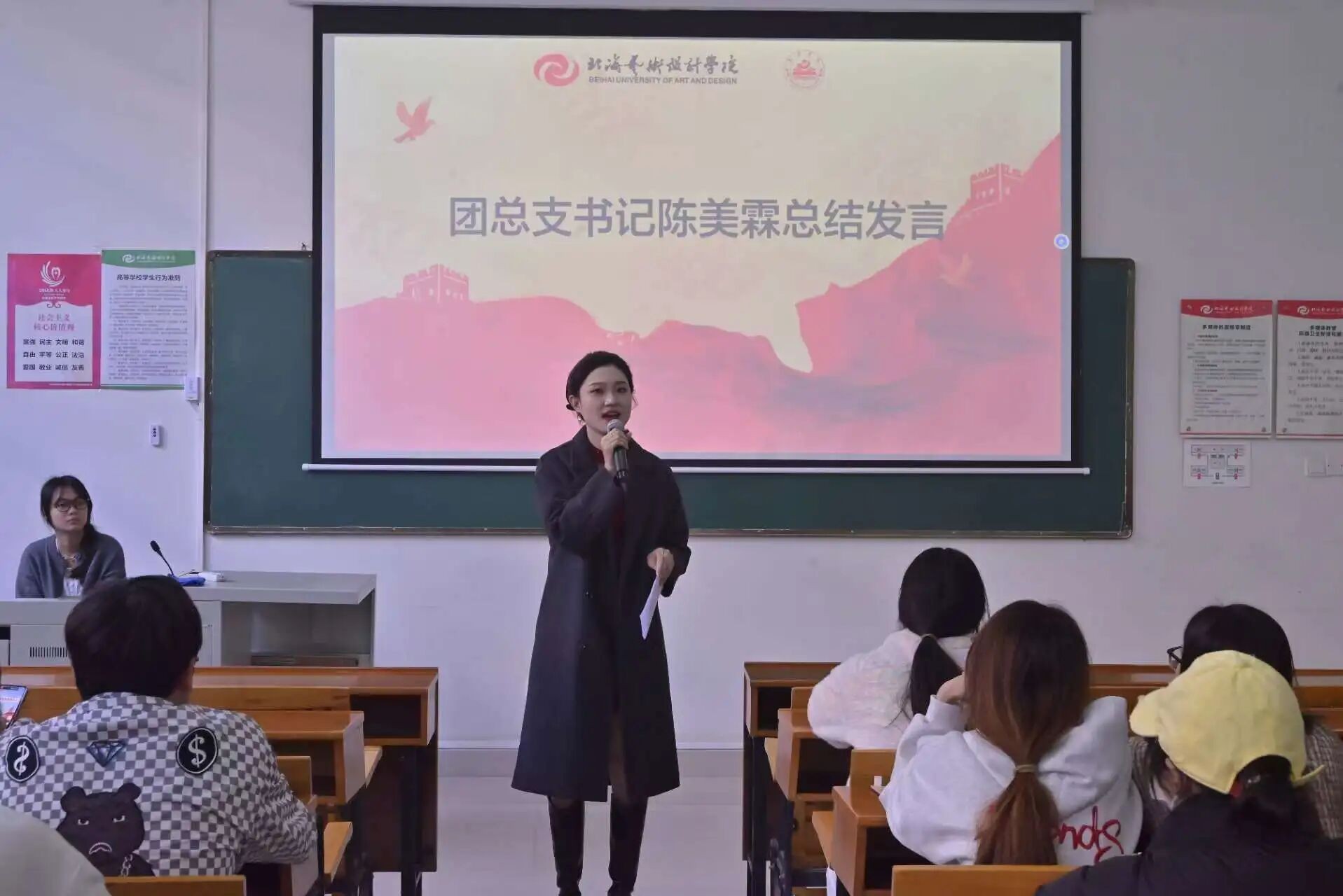 接着,团总支书记陈美霖作总结发言。首先,她充分肯定了全体学生干部本学期的辛勤付出与工作实绩,然后结合学院发展与团总支工作实际,对团员干部提出新要求,希望全体团学干部不忘初心、砥砺前行,以更饱满的热情投入到新学期的工作中。