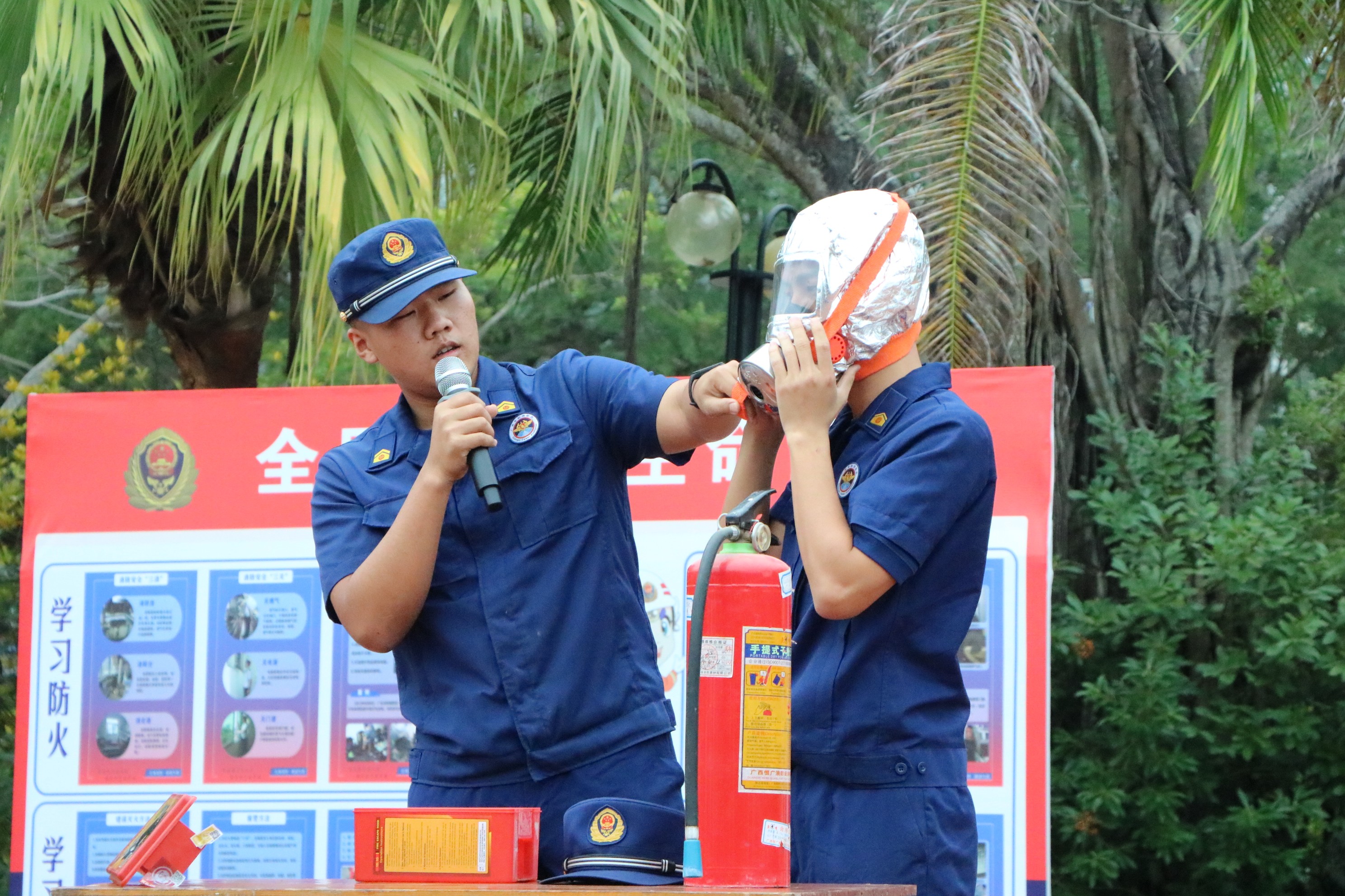 还实操作演练灭火器灭火、穿越烟道模拟火场烟道充帐篷、穿戴过滤式呼吸自救器、心肺复苏三个部分内容。