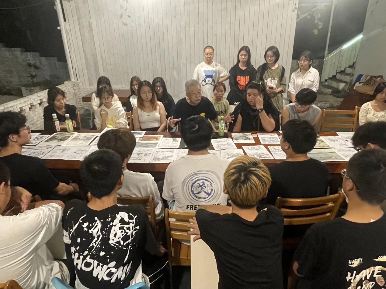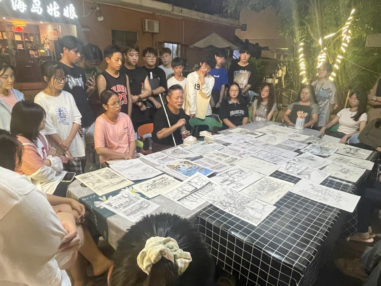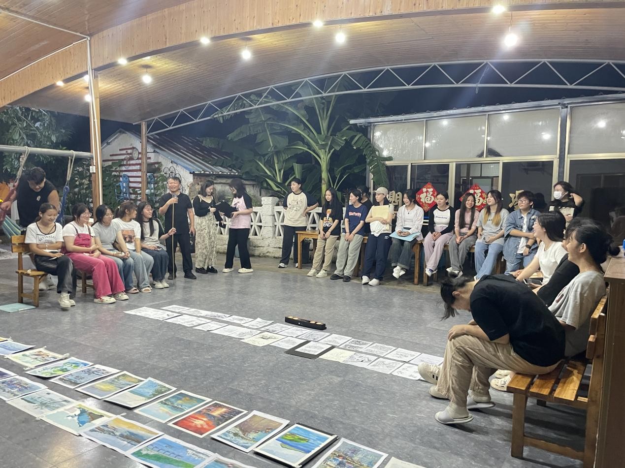 在老师们的带领下,同学们在实践过程中有序深入景区、村庄,通过观察走访体验感悟、实地踏勘拍摄记录、艺术采风绘画写生,结合课程所学知识,感受、观察、分析涠洲岛自然风貌与人文聚落,领悟地方性色彩、空间等元素的构成魅力,并以自身理解运用美术基础与设计表现技法绘出“设计色彩”图幅。过程中,老师们悉心指导,帮助同学们了解掌握取景、构图、取舍、表现。晚上,专任教师辅助指导,教授以班级为单位开展评图教学课堂。微弱灯光抵不住同学们对专业知识学习的偌大热情,每位同学积极听取指导教授的点评意见,努力提高自身的艺术涵养与表现技法。