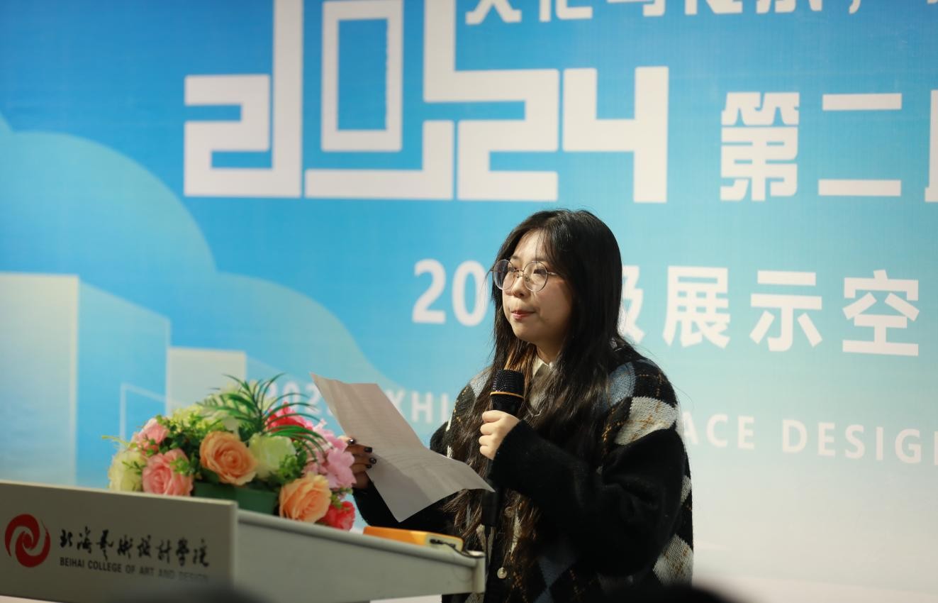 学生代表叶巧靖同学满怀激情地分享了《展示空间设计模型制作》课程中的学习经历,强调了同学们的作品均凝聚了对中国传统文化的深刻理解与艺术创新的探索,期待通过展览,让更多人感受到展示空间设计的魅力,并希望获得大家的宝贵意见以促进同学们的成长。