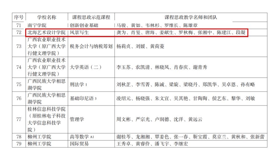 近日,根据《自治区教育厅关于公布2021年普通本科高校课程思政示范课程名单的通知》(桂教高教〔2021〕59号),北海艺术设计学院美术学院《风景写生》被教育厅认定为2021年自治区级课程思政示范课程。龚为、肖玺、唐海、罗秋梅、张湘中、陈建江、段凝老师获得自治区课程思政教学名师称号,并获思政教学团队称号。这是我校在自治区级课程思政建设上的新突破。