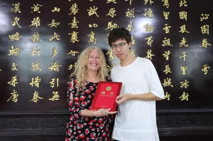 活动结尾,DeniseL.Vandeville(丹妮丝·范德维尔)校长手拿证书同在场所有教职人员 拍照留念,此次活动圆满结束。 (金凯靖 摄)