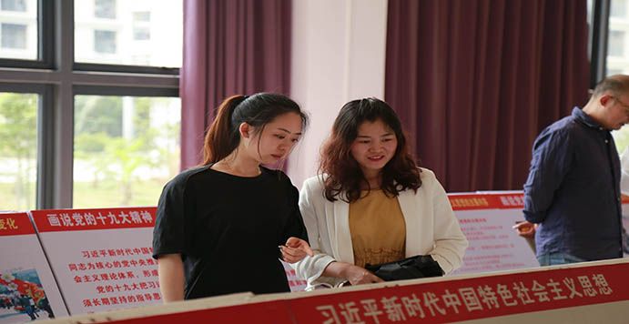 2019年3月22日中午11:40,在我院党总支的组织领导下,全院教师党员、学生党员、发展对象与入党积极分子一起来到我校西校区图书馆一楼观看学习了《画说习近平新时代中国特色社会主义思想》和《画说党的十九大精神》的展览。