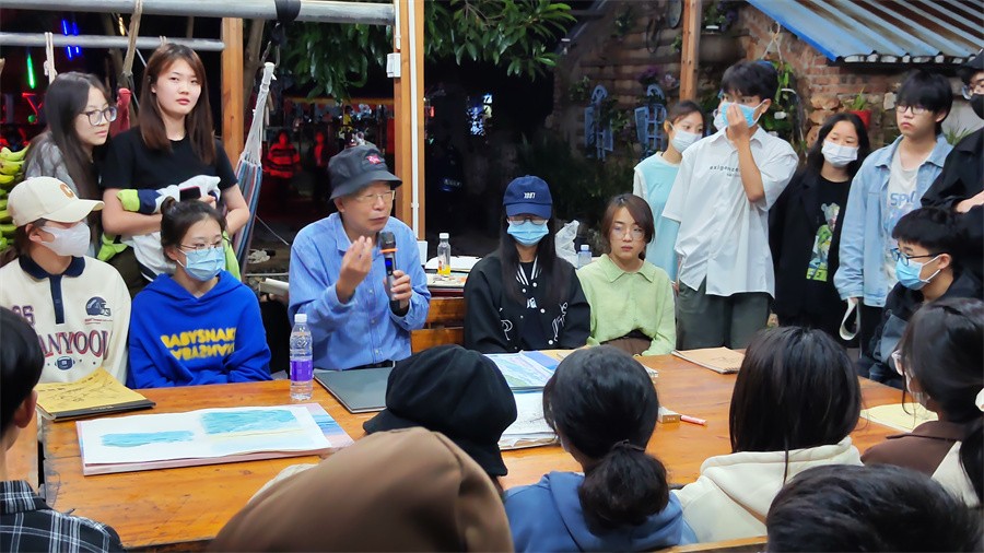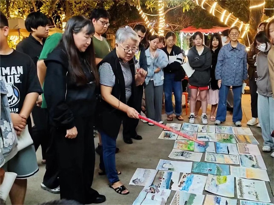 当日写生结束后,各教授和任课教师对学生当日写生作业进行精彩点评。从选景构图、色彩关系、透视原理、光影表现、空间处理、用笔技巧等要素详细阐述,针对性地指出学生作品的优点与存在问题,并对学生在创作过程中遇到的疑惑进行了悉心解答,传授给学生们风景写生经验。
