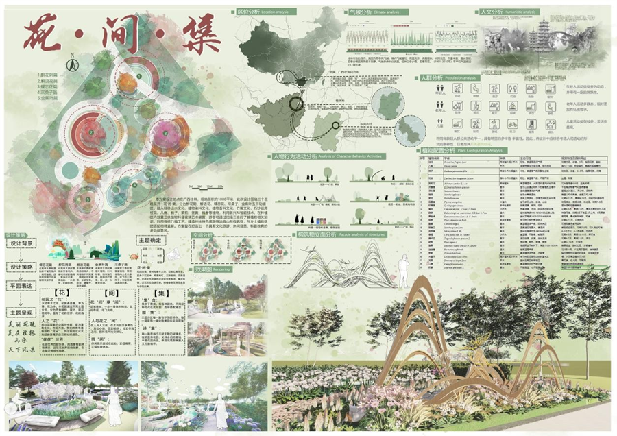 据悉,本次竞赛共有8所高校、139组、500余名学生参赛,竞赛设置了专科组、本科组、研究生组,以“ 食 · 色花园”为主题,旨在进一步鼓励和激发广西园林学子的设计创作热情和创新意识,弘扬工匠精神,培养园林设计实践创新型人才。