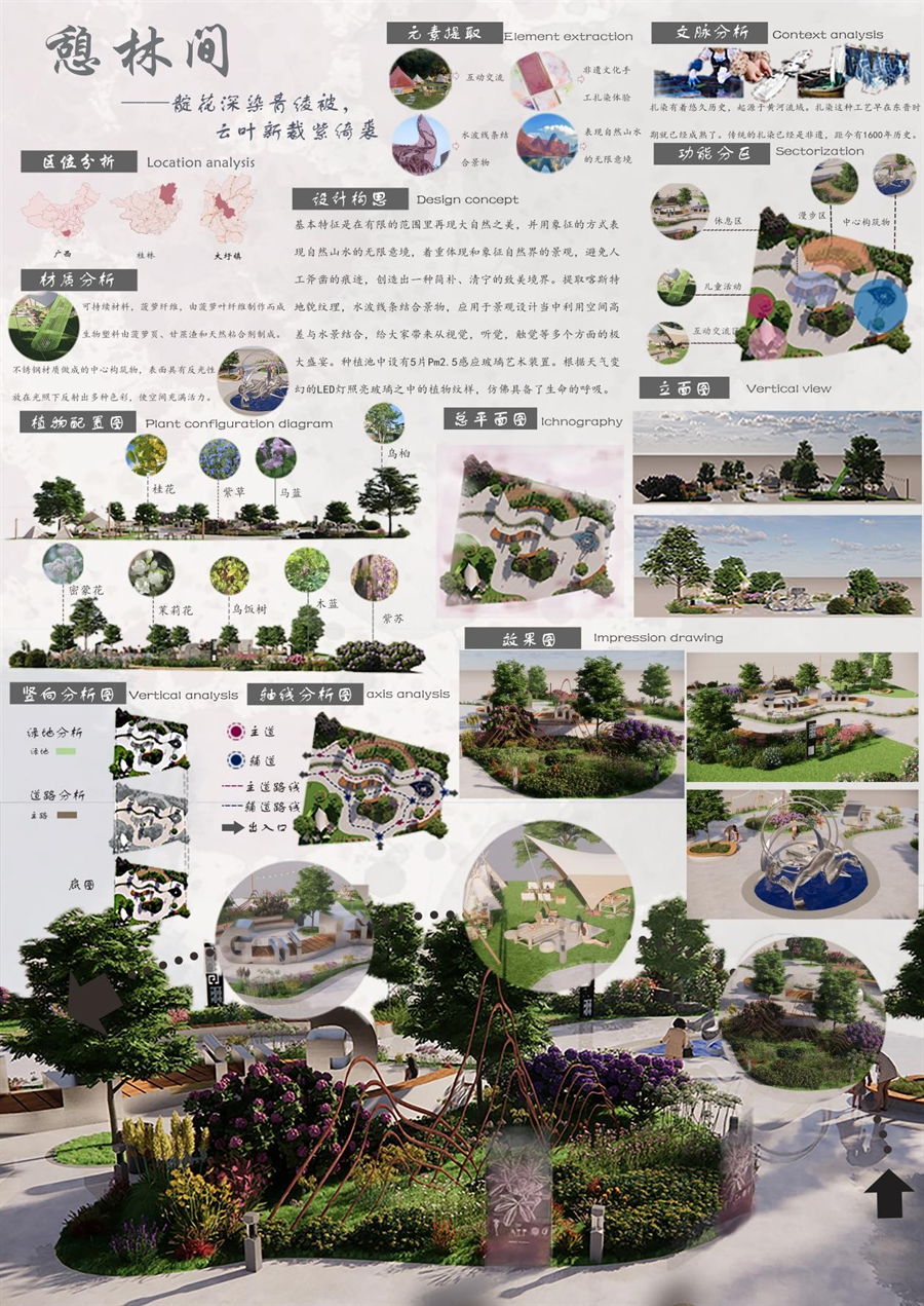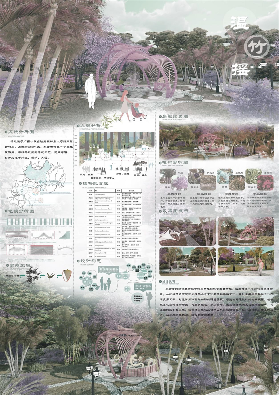 近日,由广西风景园林学会主办,桂林理工大学旅游与风景园林学院和东漓古村联合承办,广西大学林学院、广西艺术学院建筑艺术学院、桂林旅游学院旅游管理学院、玉林师范学院生物与制药学院/农学院、广西大学行健文理学院理工学部、广西建设职业技术学院建筑与规划学院协办的第三届广西“桂花杯”小花园设计竞赛圆满落幕。我校建筑与环境艺术学院学生作品《温竹摇》(作者:钟小雨、郭文静)获一等奖,《憩林间》(作者:徐子涵、郦嘉倩、裘嘉茵、朱潘格)获三等奖、《花间集》(作者:陈倩倩、刘雨薇、马晓晓、黄莹、温文丽)获三等奖,建筑与环境艺术学院昌秋霞老师获“优秀指导教师”荣誉,我校获“优秀组织单位”荣誉。