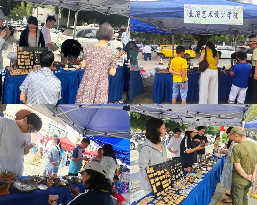 据悉,本次活动由北海市总工会、市旅游文体局、市工商联、市民宗侨务局联合主办,旨在传承中华优秀传统文化,推动非遗手工艺与特色文创产业发展。我校造型艺术学院高度重视本次展销活动,精心组织师生团队,将陶瓷、贝雕、竹刻等非遗特色产品带到集市现场,凭借精巧的设计、鲜明的地域特色与实用的创意理念,吸引众多市民、非遗传承人、文创从业者驻足观看、咨询交流。