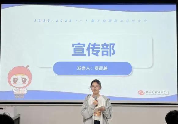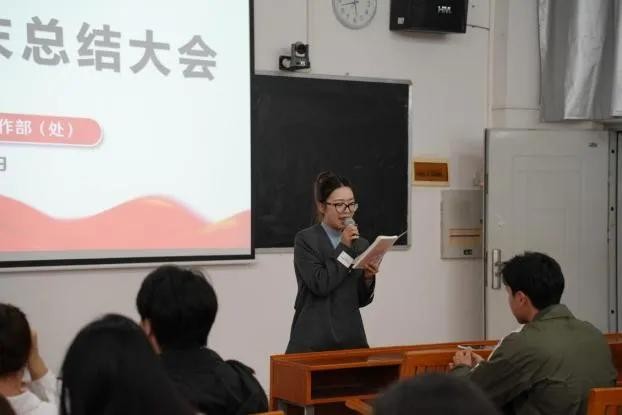 颁奖环节后,班媚部长发表讲话。她首先向一学期以来为学生工作默默奉献的全体学工助理表达了衷心感谢,并特别强调,学工助理岗位不仅是服务的平台,更是锻炼与成长的宝贵机会。她鼓励大家珍惜在岗位中的实践经历,在服务同学中涵养奉献精神,在应对挑战中锤炼综合能力,在各类活动中提升责任意识,真正实现在工作中学习、在实干中成长。