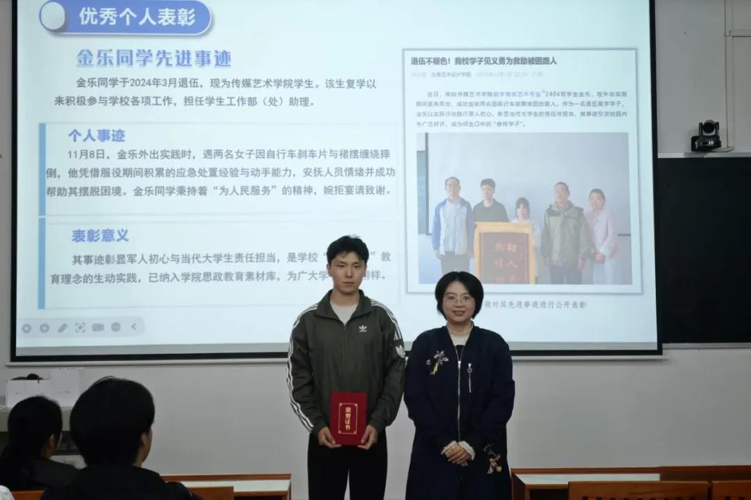为表彰先进、树立榜样,本次大会特设庄重而温暖的表彰环节。学工部(处)部(处)长班媚老师为金乐同学颁发“见义勇为先进个人”荣誉证书。这一刻,全场响起持久而热烈的掌声,不仅向受表彰的同学致以敬意,也将整场大会的氛围推向高潮,彰显了榜样引领、向上向善的团队风貌。